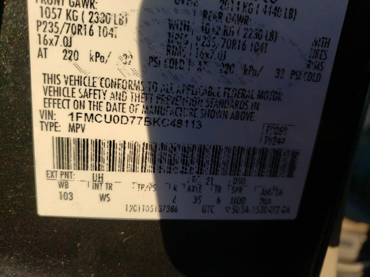 FORD ESCAPE BLACK 1FMCU0D77BKC48113