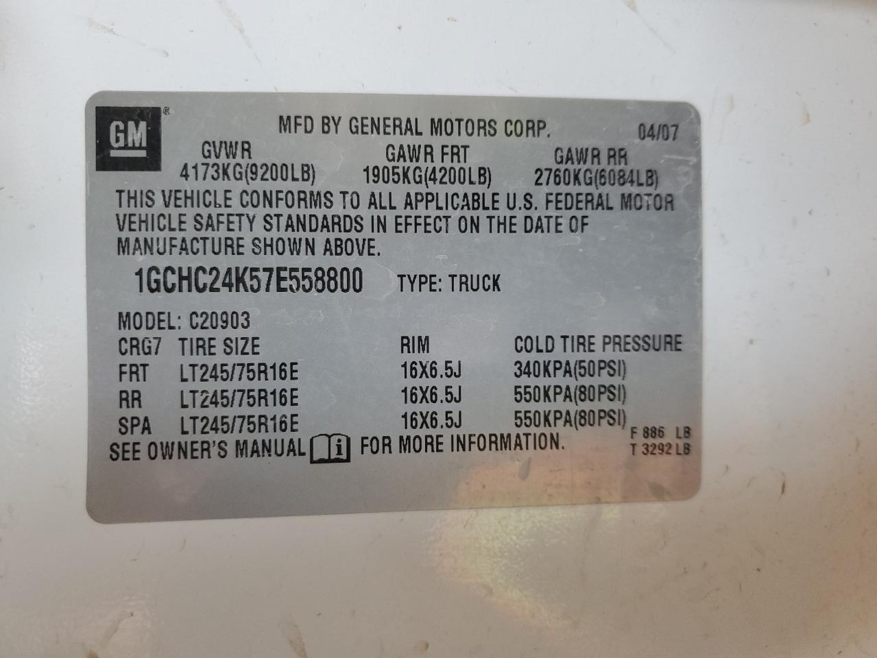 CHEVROLET ALL Models WHITE 1GCHC24K57E558800