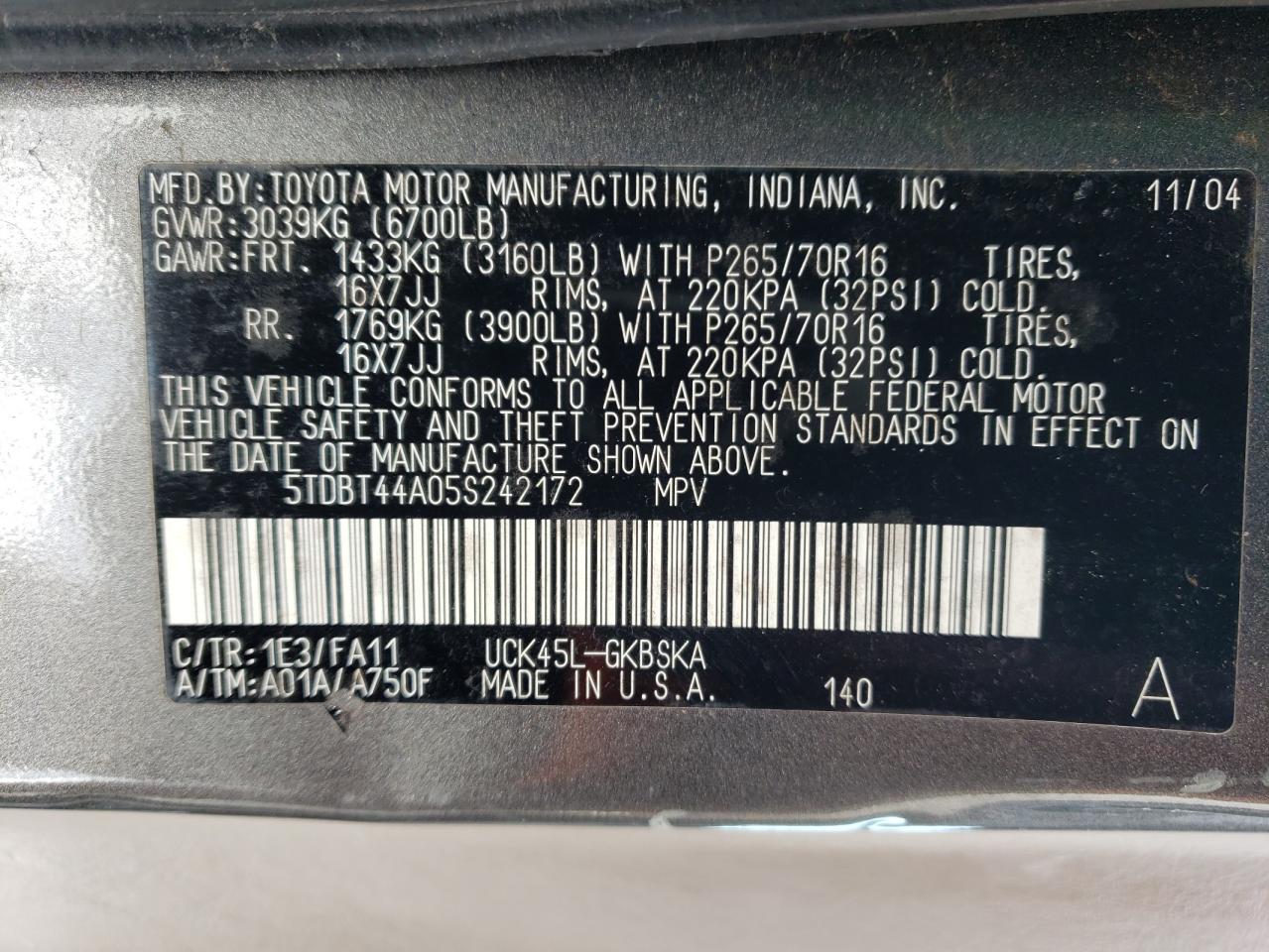 TOYOTA SEQUOIA GRAY 5TDBT44A05S242172